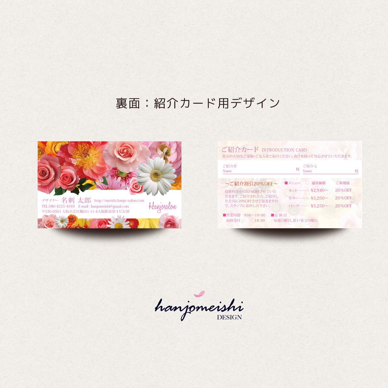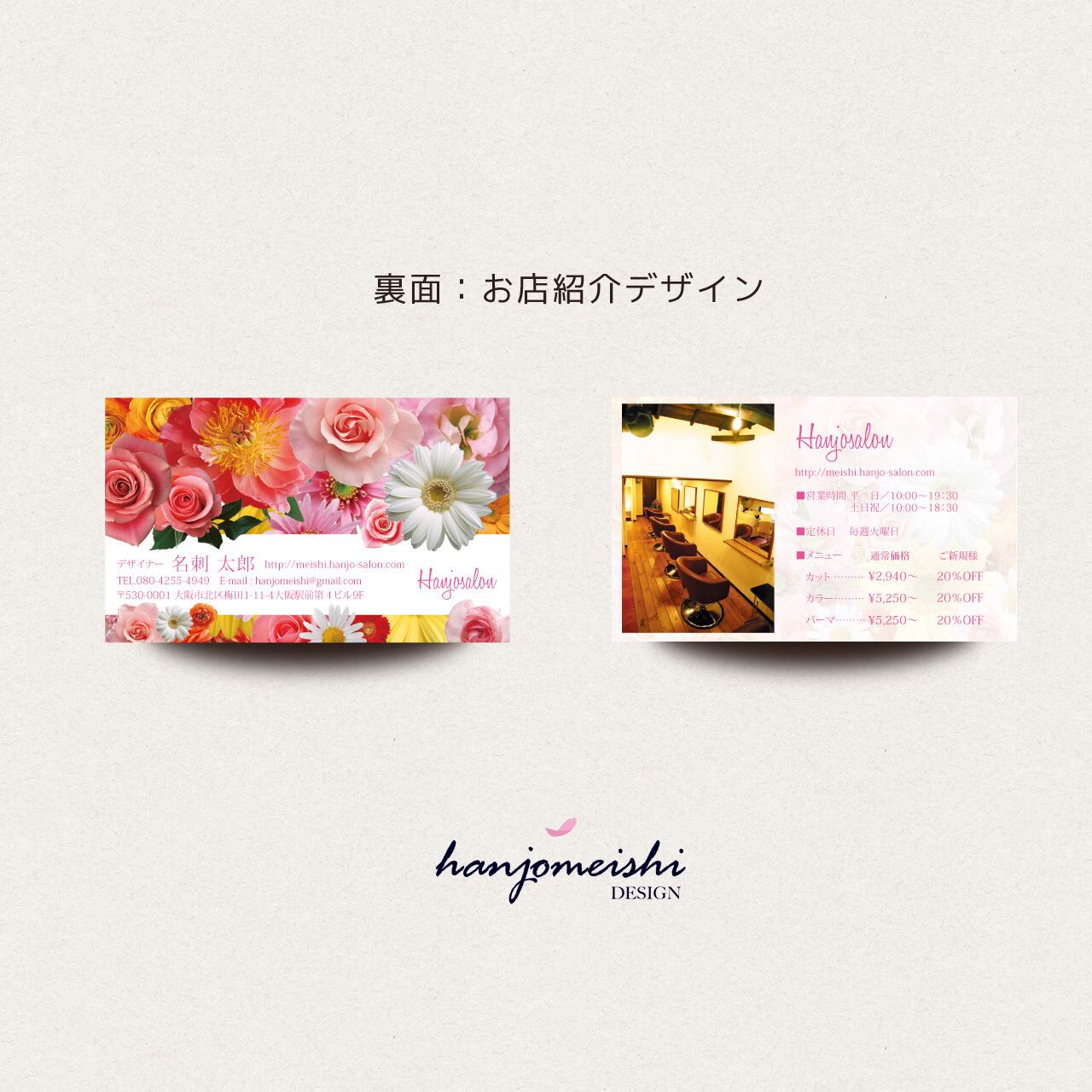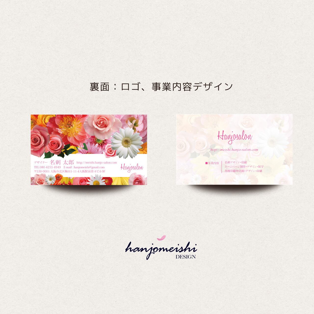 表面・裏面デザインに関してはあくまでサンプルとして掲載しておりますので、文章や写真は自由に変更できます。またロゴマーク・QRコード・なども自由に掲載できます。