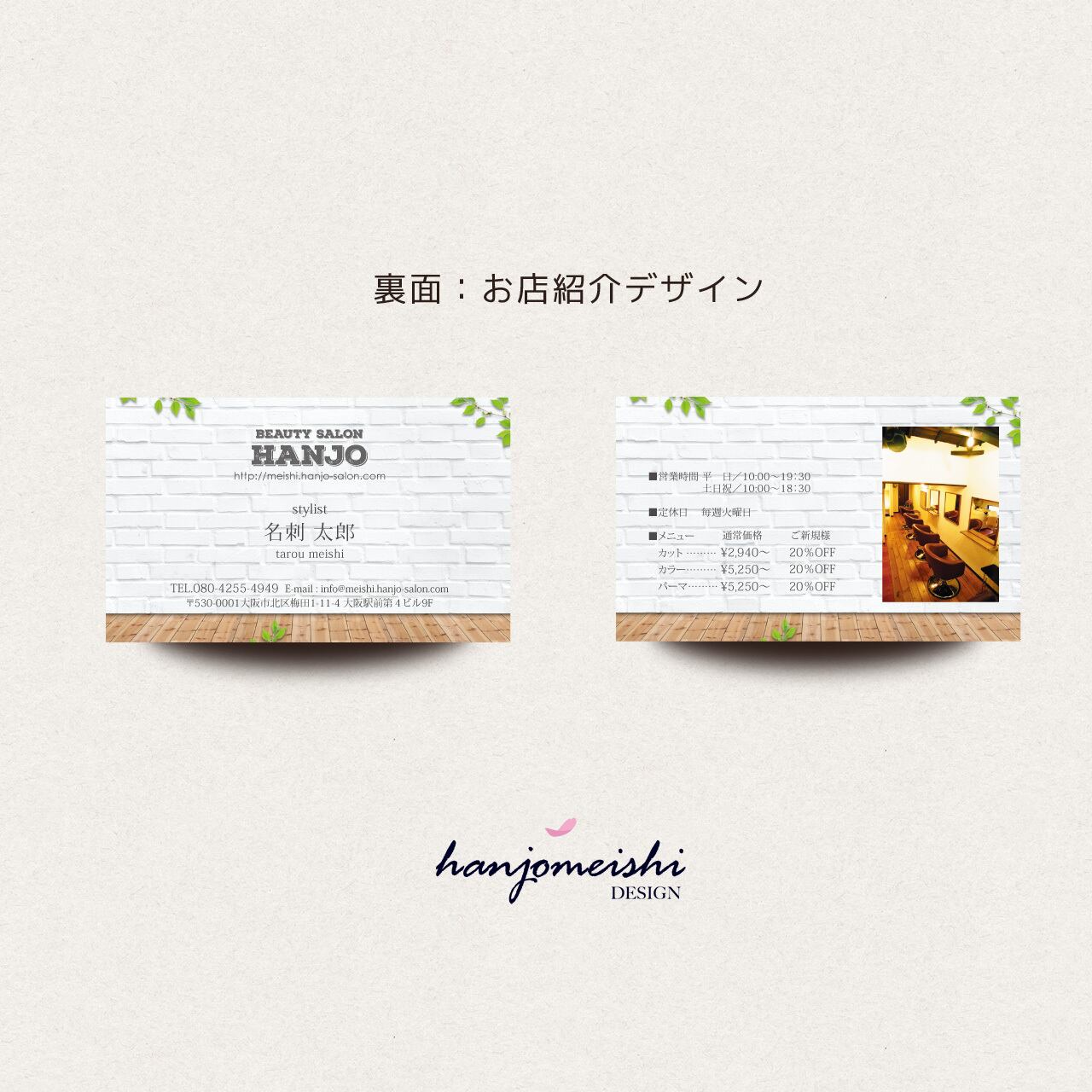 表面・裏面デザインに関してはあくまでサンプルとして掲載しておりますので、文章や写真は自由に変更できます。またロゴマーク・QRコード・なども自由に掲載できます。
