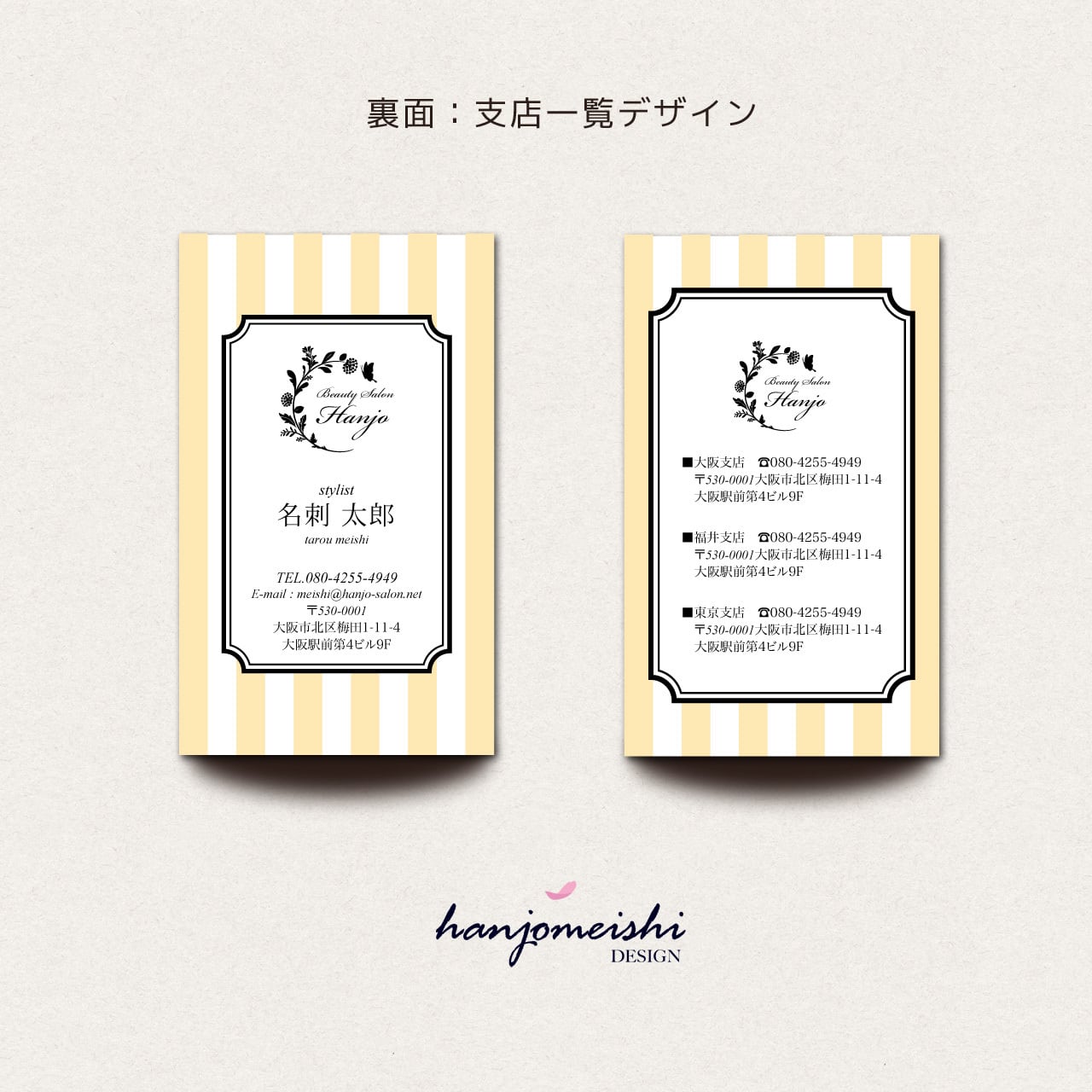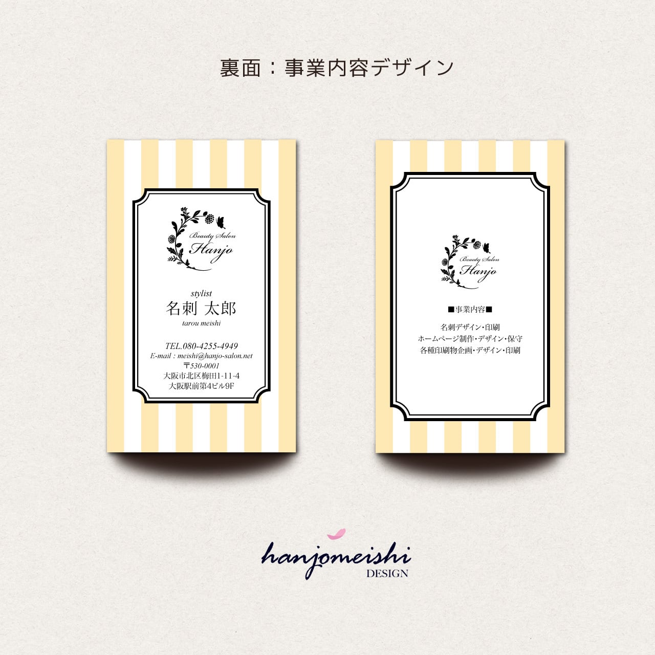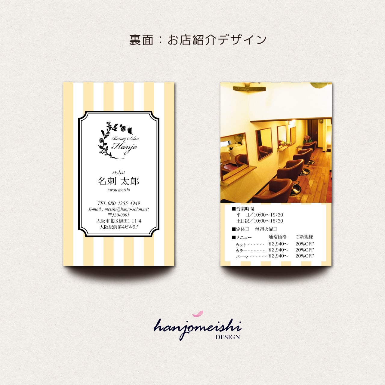 表面・裏面デザインに関してはあくまでサンプルとして掲載しておりますので、文章や写真は自由に変更できます。またロゴマーク・QRコード・なども自由に掲載できます。