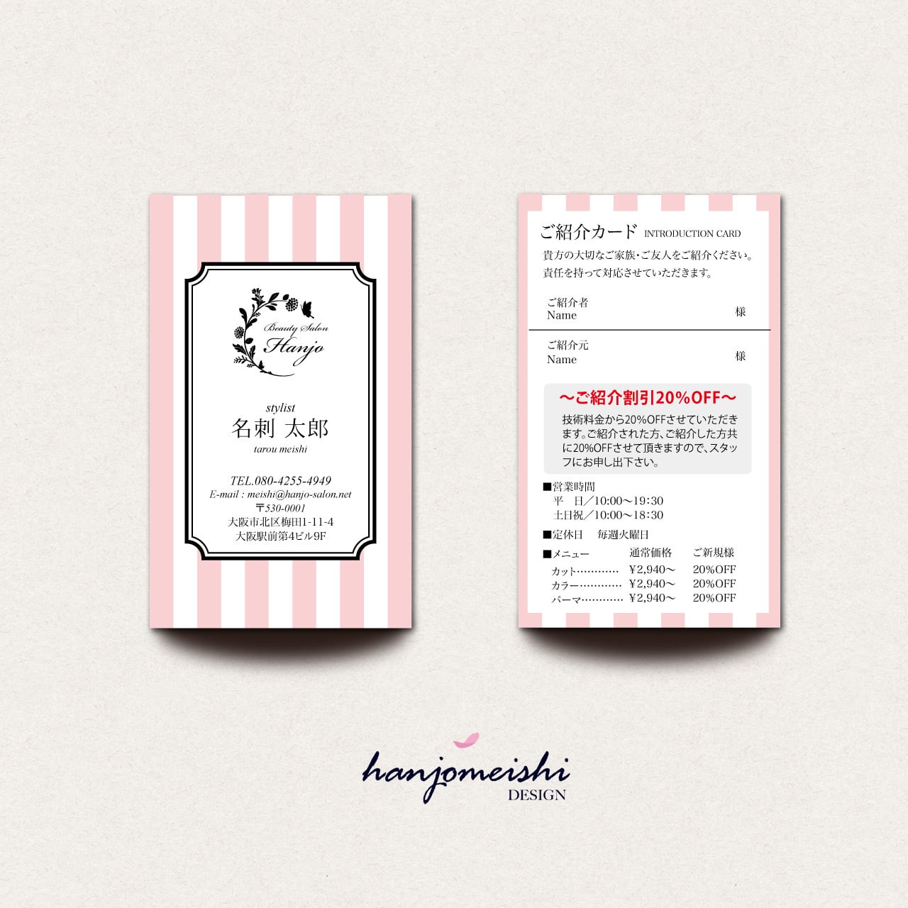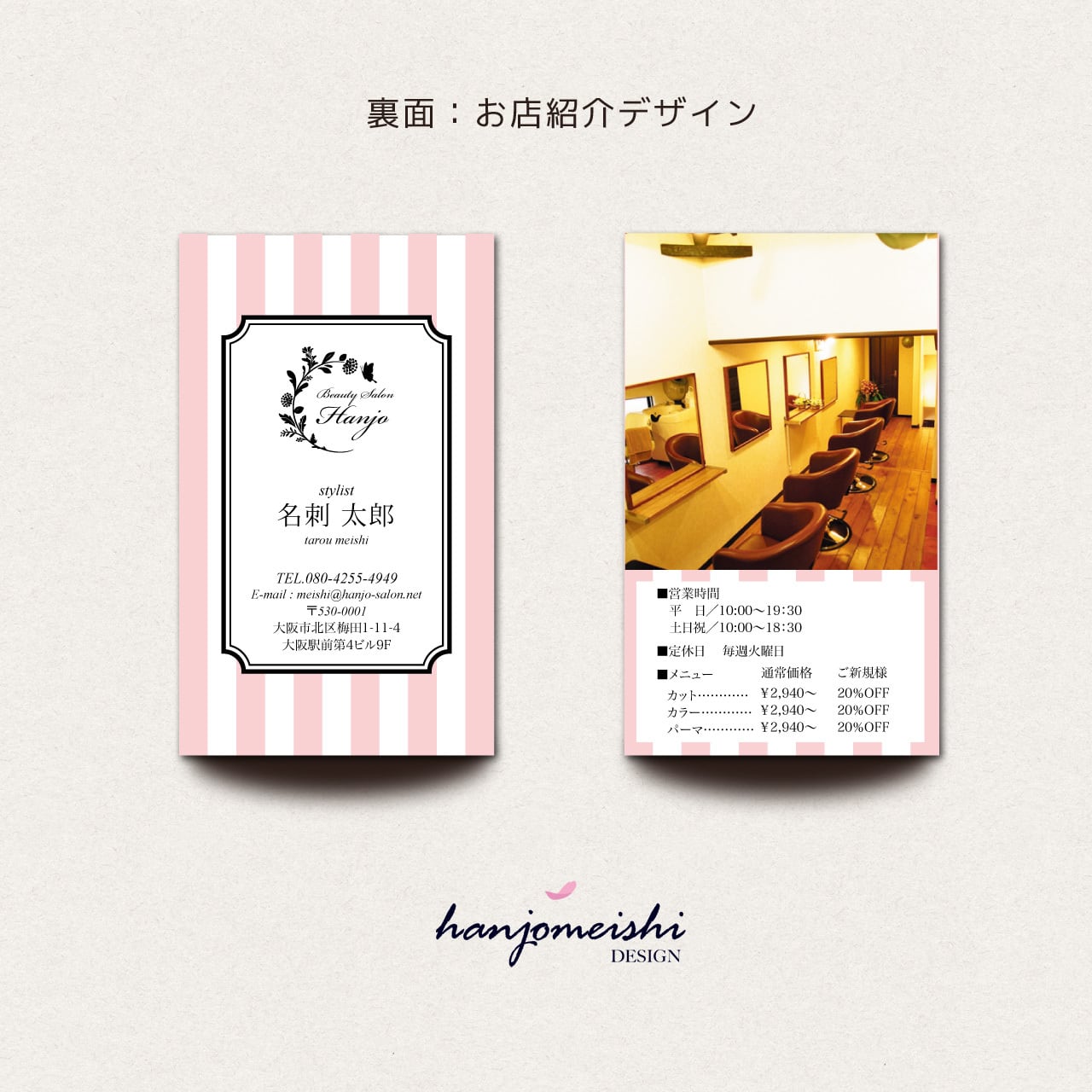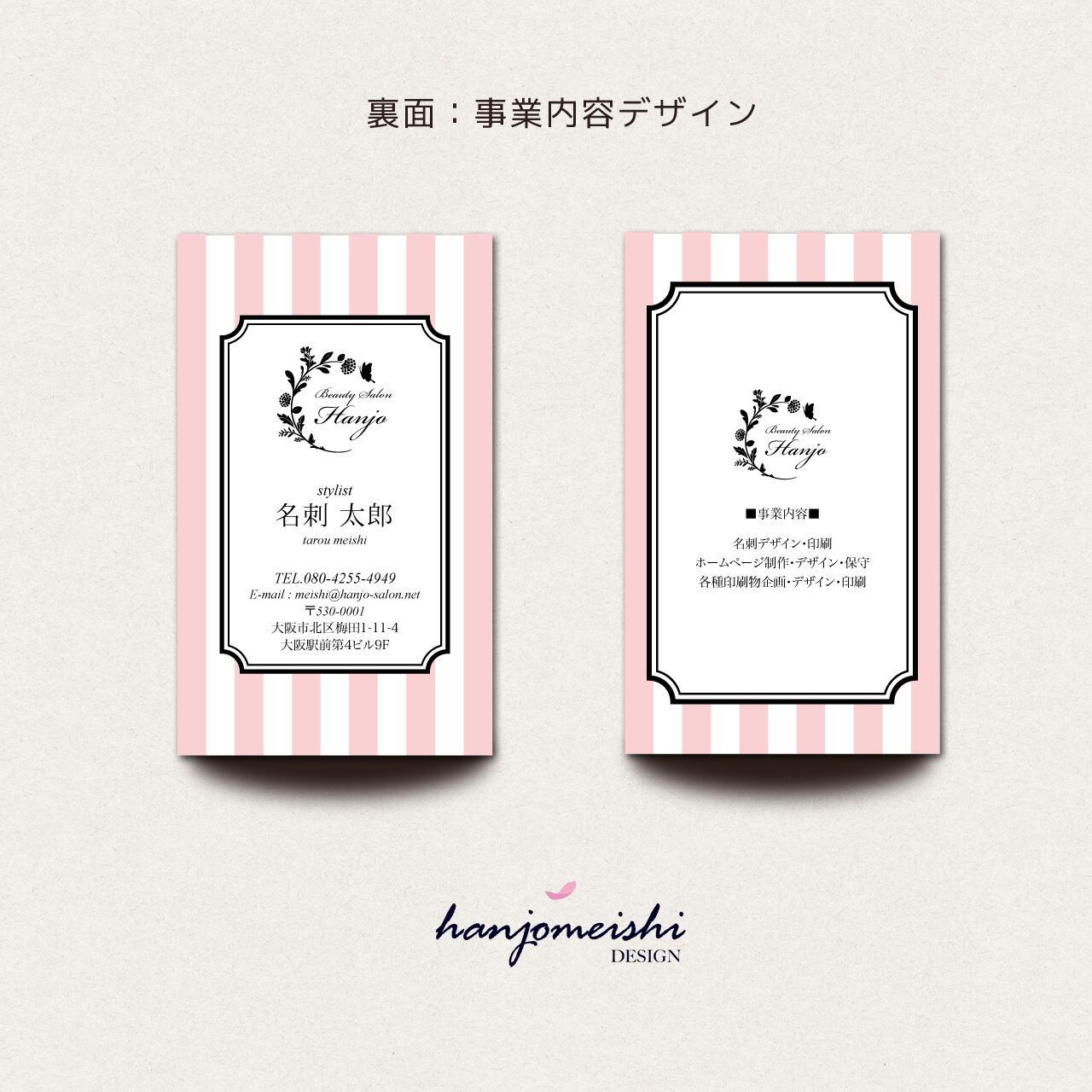 表面・裏面デザインに関してはあくまでサンプルとして掲載しておりますので、文章や写真は自由に変更できます。またロゴマーク・QRコード・なども自由に掲載できます。
