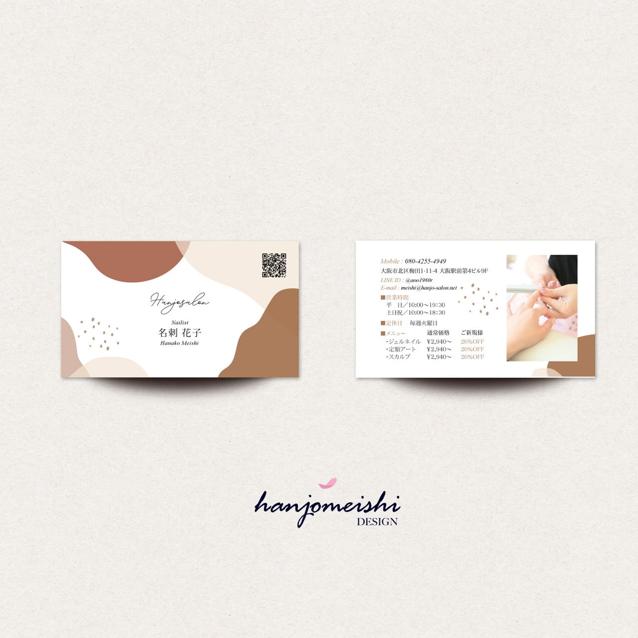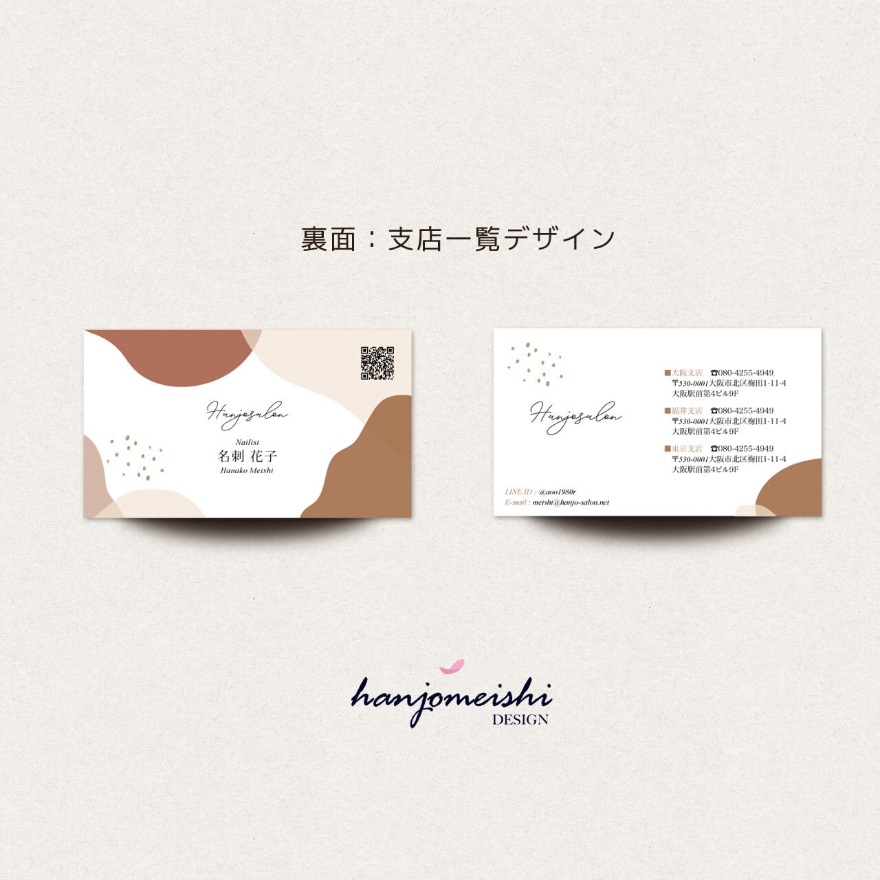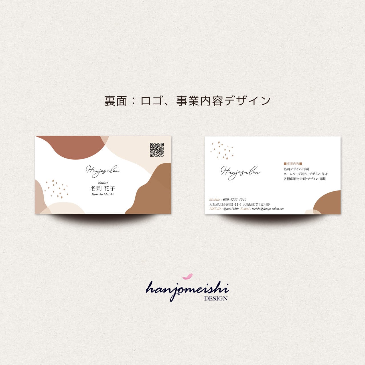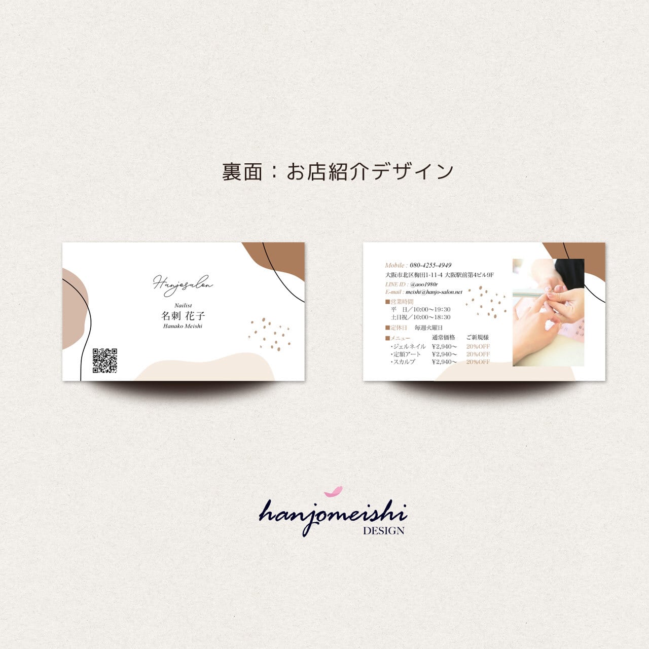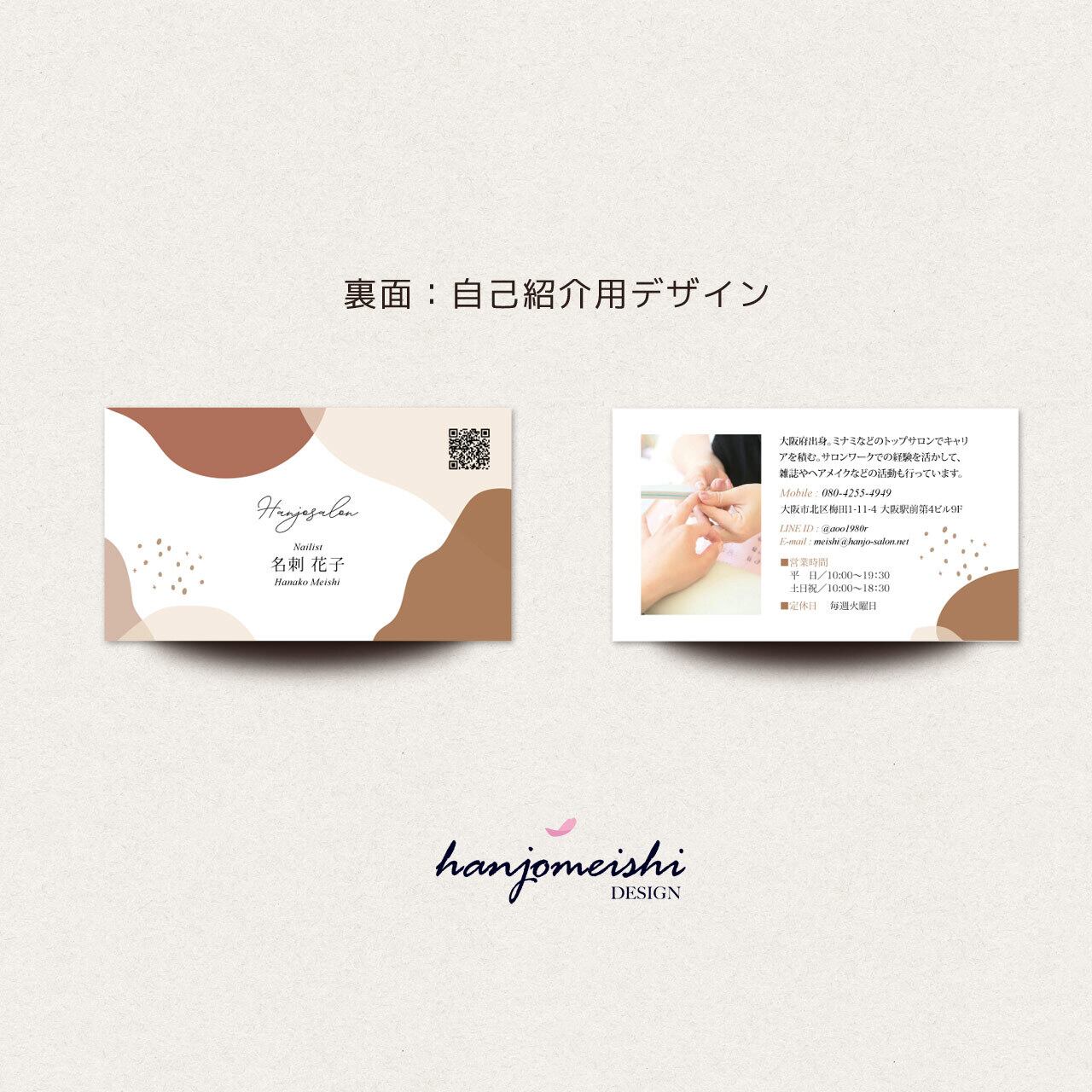 表面・裏面デザインに関してはあくまでサンプルとして掲載しておりますので、文章や写真は自由に変更できます。またロゴマーク・QRコード・なども自由に掲載できます。
